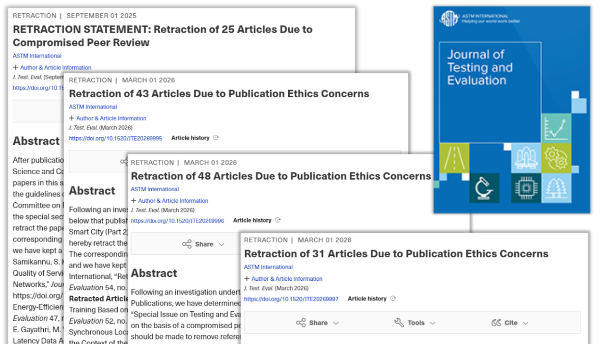 The American Society For Testing And Materials (ASTM) International started an investigation into its Journal of Testing and Evaluation after an ASTM vendor noticed some “irregular patterns in the peer review” in a special issue, spokesperson Gavin O’Reilly told Retraction Watch. When the publisher confirmed those patterns, ASTM decided to investigate several related issues, he said.