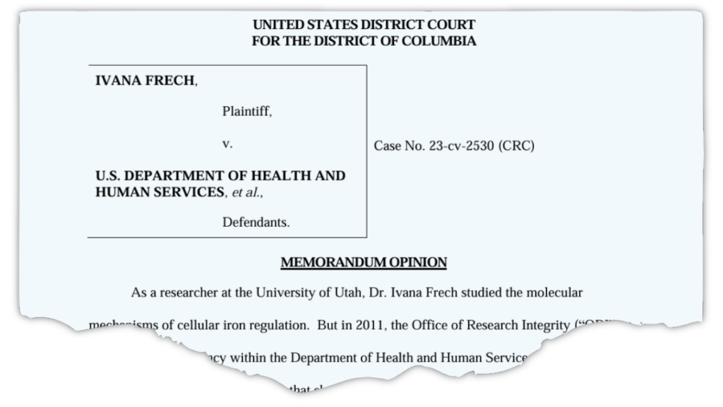 On December 12, the U.S. District Court for the District of Columbia threw out Frech’s suit, ruling in favor of the government’s motion for summary judgement. Summary motions are granted when a court finds no genuine dispute over material facts and a lack of conflicting evidence for a jury to weigh. The decision allows ORI’s three-year debarment – which runs through August 2026 – and misconduct conclusions against Frech to stand.