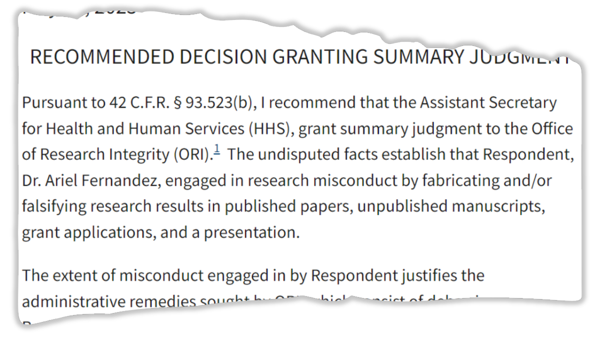 In a May 2025 decision, administrative law judge (ALJ) Margaret G. Brakebusch concluded that “undisputed facts” establish Ariel Fernández engaged in research misconduct by falsifying research results in published papers, grant applications and other materials while serving as a professor at Rice University in Houston. Brakebusch recommended HHS affirm the proposed sanctions made by the Office of Research Integrity in a 2022 charging letter — including a 15-year ban from federal funding for Fernández, an Argentine chemist.