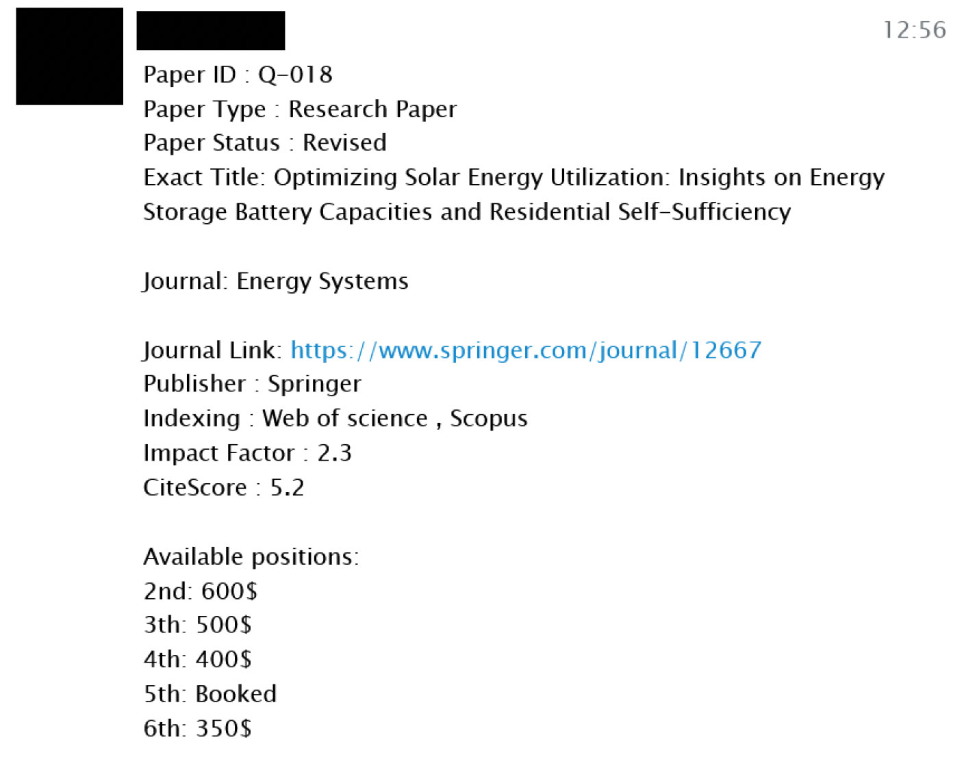 The Iraq-based paper mill posted an advertisement in March 2024 targeting the Springer Nature journal Energy Systems with a paper titled “Optimizing Solar Energy Utilization: Insights on Energy Storage Battery Capacities and Residential Self-Sufficiency.” The authorship slots were advertised for $350 to $600. According to the advertisement, the paper had already passed the revision stage.
