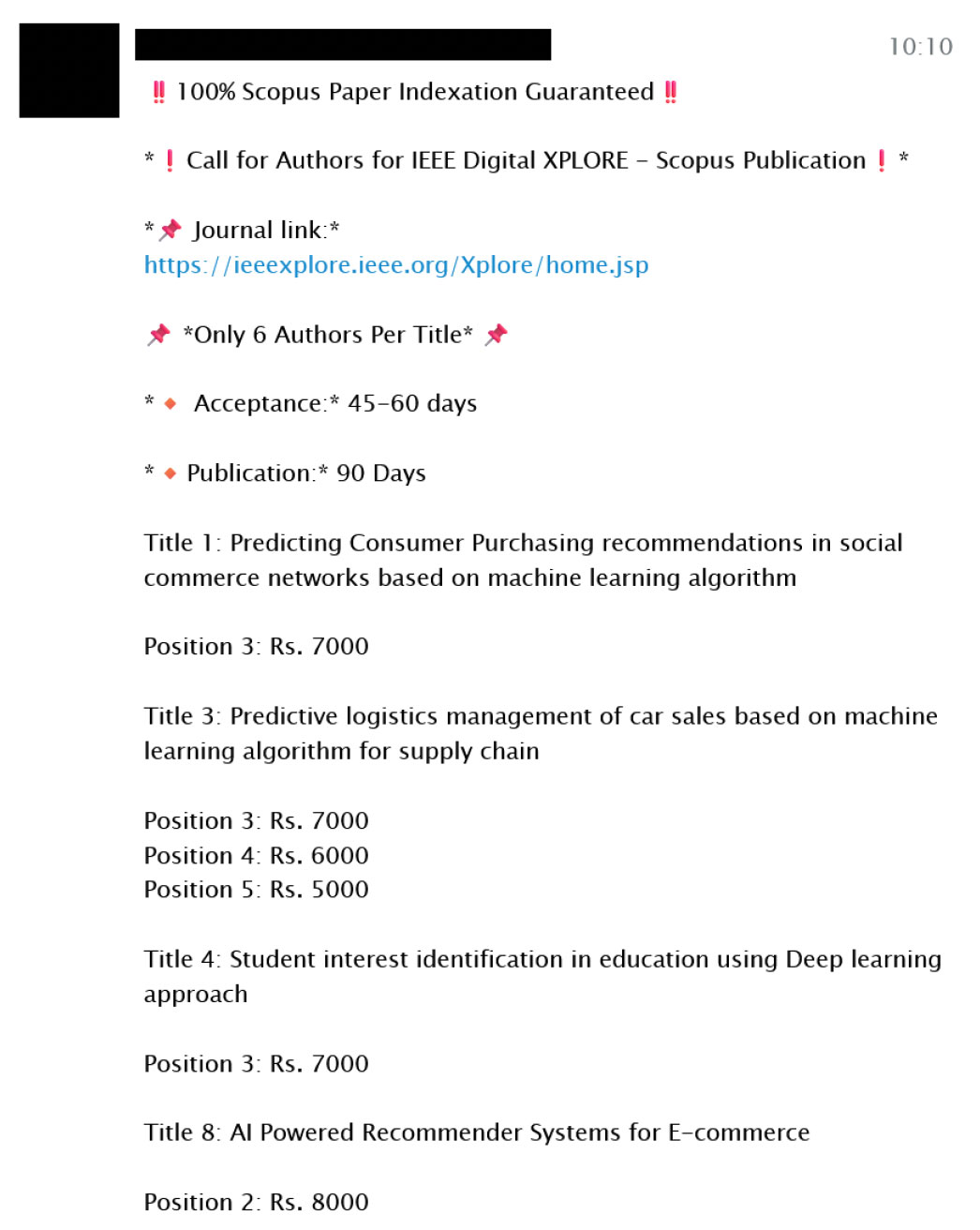 The Indian paper mill almost exclusively advertised authorship positions in Institute of Electrical and Electronics Engineers (IEEE) conference proceedings and small, regional journals, with IEEE ads accounting for about 20 percent of the advertisements that named a specific publication. One ad posted in June 2024 called for authors on four papers targeting IEEE Xplore, promising Scopus indexation and no more than six authors per title. A spokesperson for IEEE told us, “When we become aware of possible issues with content, we take the time to carefully review and, when warranted, we retract nonconforming publications.”
